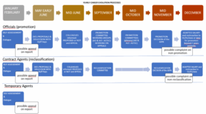 Le nombre d’agents promus et reclassés dépend du budget annuel disponible et des règles y afférentes (modalités d’application de l’article 45 et de l’annexe I B du statut pour les Fonctionnaires, diverses décisions pour les Agents Contractuels). Le temps moyen passé dans chaque grade avant d’être promu varie. Bien sûr, votre promotion ou votre reclassement dépend principalement de la qualité et de l’efficacité de votre travail. Cependant, ce n’est pas toujours suffisant. Les processus de promotion et de reclassement sont annuels et consiste en plusieurs étapes. Ci-dessous, vous pouvez trouver un visuel de toutes les étapes de ces processus :